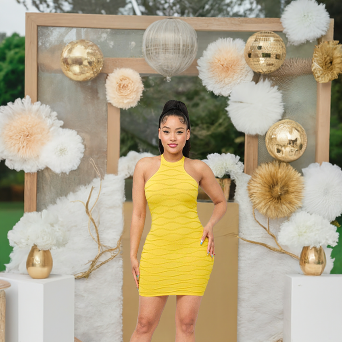 Yellow Halter Neck Textured Bodycon Yara (Mini Dress)-Kasheer Royalty