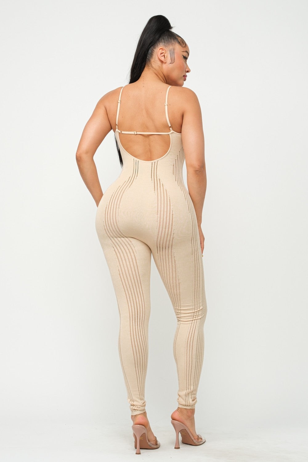 Elevate your wardrobe with the Dez Nude Pointelle Jumpsuit, a stunning piece that combines sophistication with modern edge. This figure-flattering design features a daring low-cut neckline and strategic cutout details throughout, creating an alluring silhouette perfect for making a statement. The delicate pointelle fabric adds texture and visual interest while maintaining an elegant, neutral aesthetic.