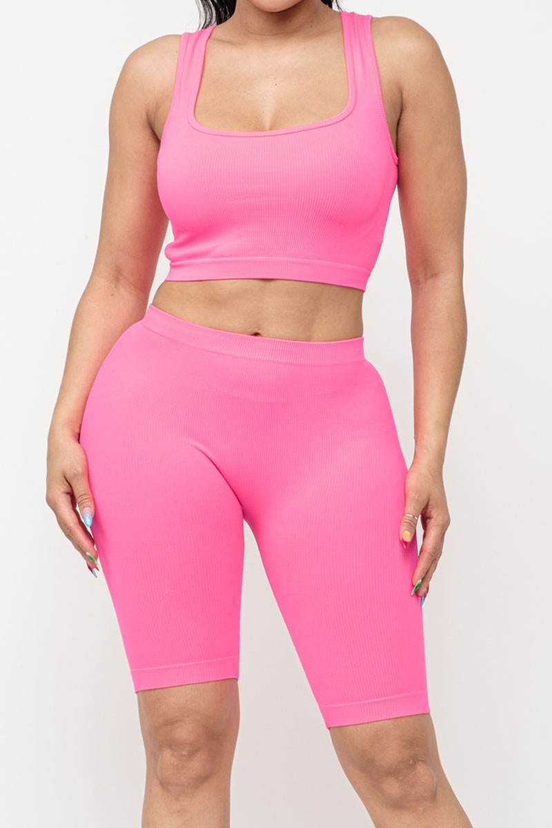 - Matching high-waisted biker shorts, extending to just above the knee.The waistband is elastic and seamless, adding to the streamlined silhouette.