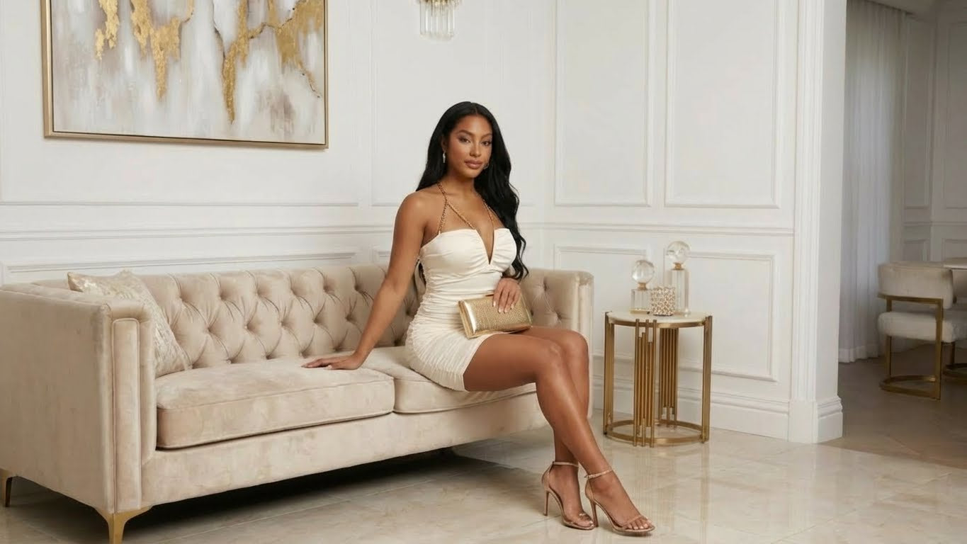 Turn heads in this stunning White Luxe Chain Sweetheart mini dress. The delicate gold chain halter neck creates an alluring, sophisticated look that flatters your silhouette while the sweetheart neckline adds timeless elegance. Perfect for nights out, parties, or any occasion where you want to feel confident and captivating. The mini length showcases your style with just the right amount of edge.